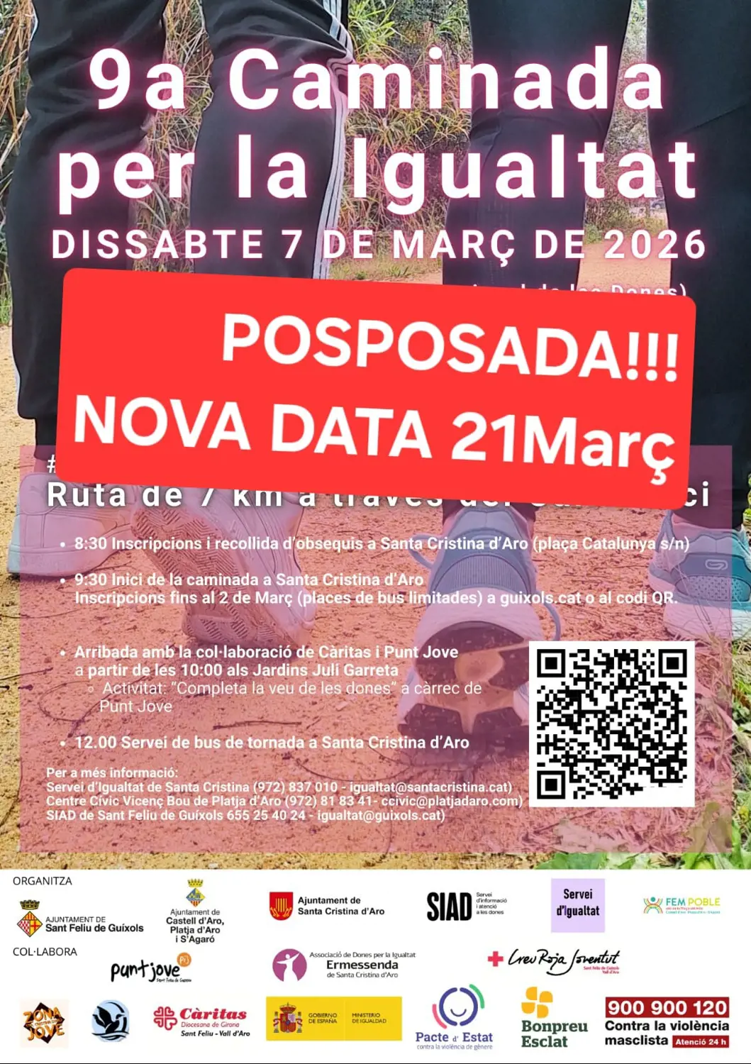 📢 Us informem que tenim nova data per la 9ª Caminada per la Igualtat: 21 DE MARÇ! Confiem que farà bon temps i podrem caminar i reivindicar amb molta força!
