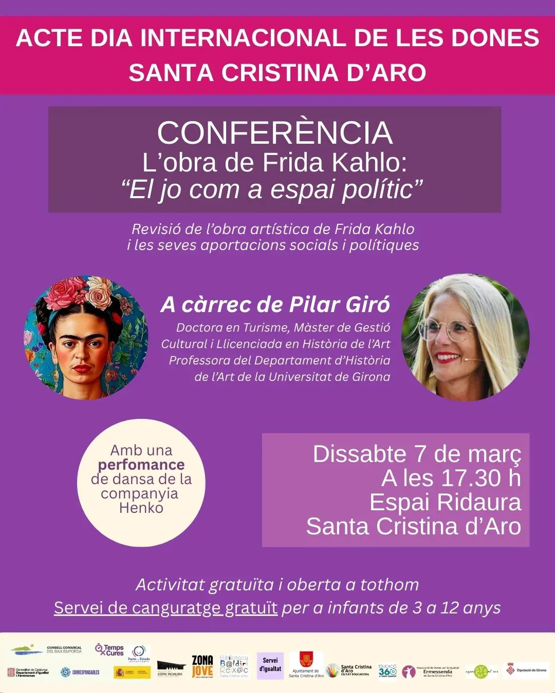 CONFERÈNCIA "El jo com a espai polític". Obra i vida de Frida Kahlo a càrrec de Pilar Giró, Doctora en Turisme, Màster de Gestió Cultural, Llicenciada emn Història de l'Art i professora del Departament d'Història de l'Art de la Universitat de Girona.