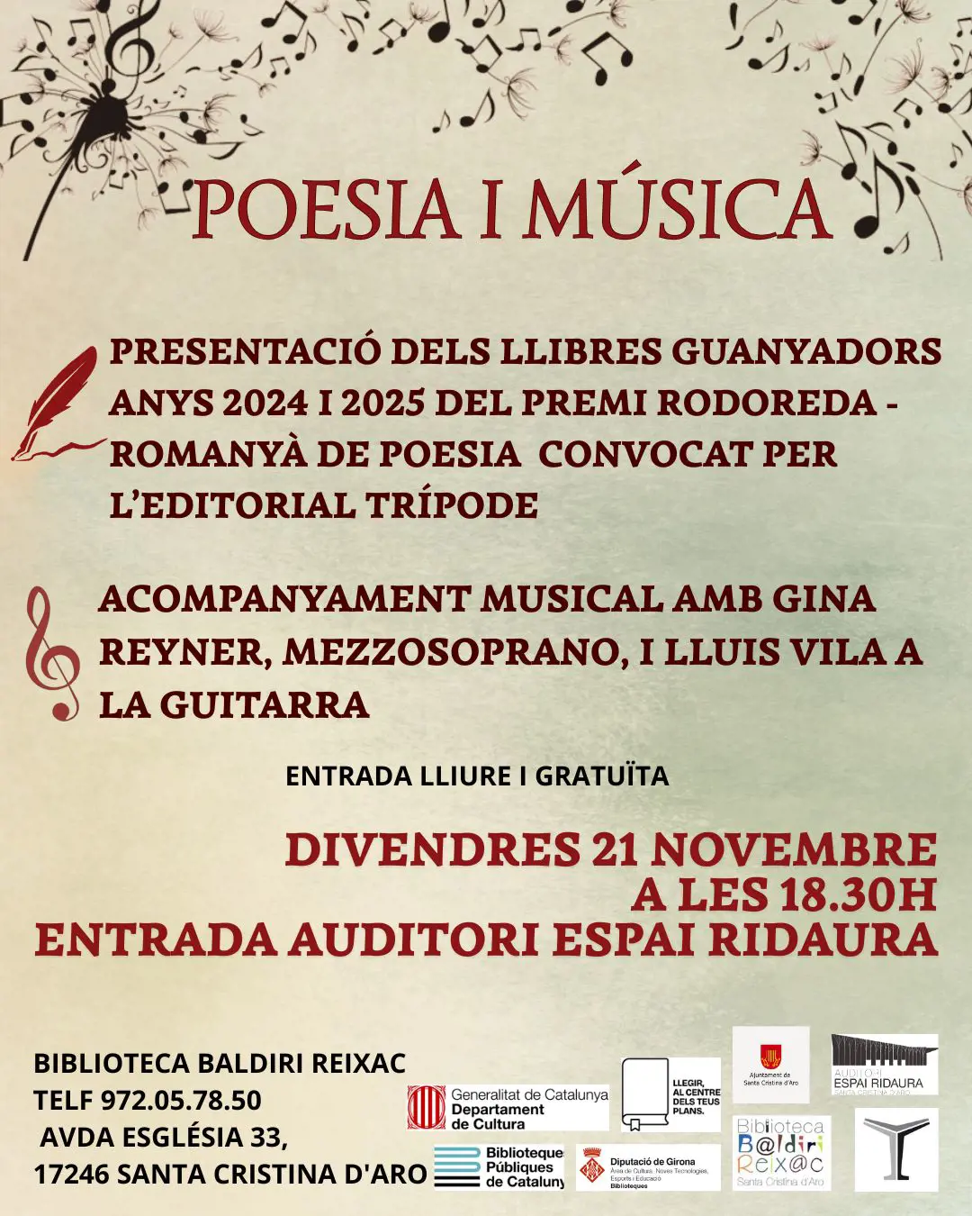 Divendres 21 de novembre a les 18.30h a l'entrada de l'Auditori de l'Espai Ridaura: Poesia i Música