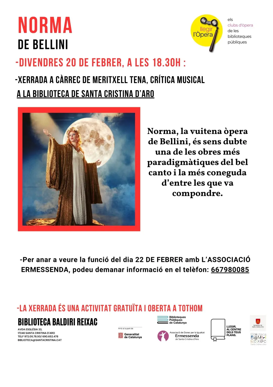 Xerrada d'òpera: Norma de Bellini el divendres 20 de febrer a les 18.30h a la biblioteca de Santa Cristina. La xerrada anirà a càrrec de Meritxell Tena, crítica musical.