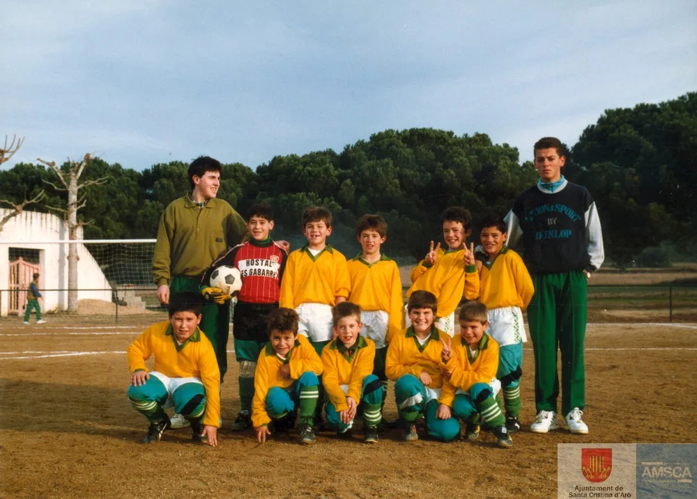 Imatge: Retrat de l’equip benjamí del Cristinenc. En aquesta ocasió, lluint la segona equipació, que no era de color verd, sinó groc, 1989-1992 (aprox.) [Autor desconegut. 14.14. Col·lecció del Centre Recreatiu i Esportiu Cristinenc, 08737. Donació de Susi Roselló Picas].
