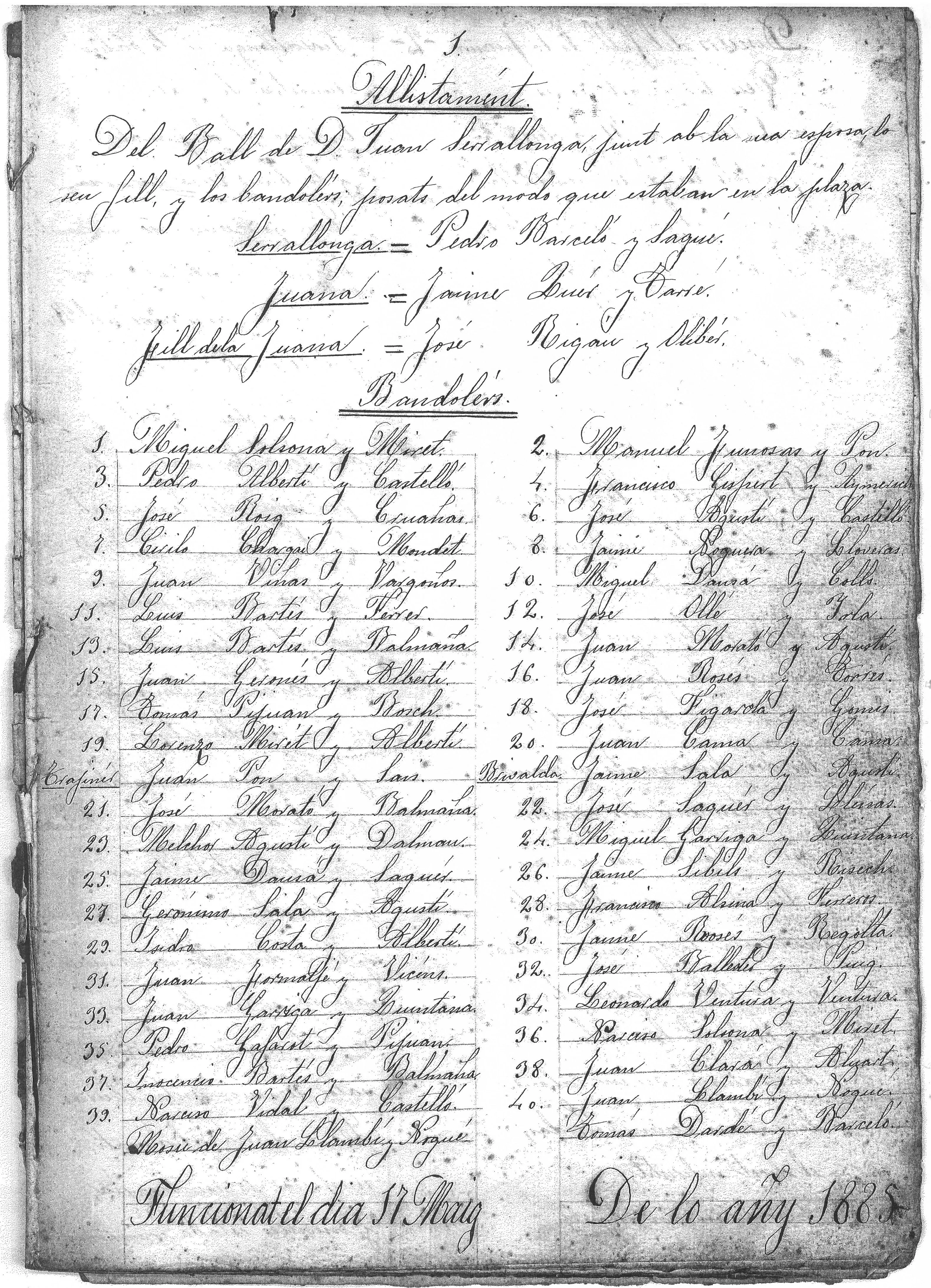 Document del Ball d’en Serrallonga del 17-5-1885. 28 pàgines. Autor del text: Jeroni Sala i Agustí.