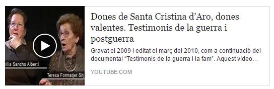 Aquest altre vídeo de testimonis, titulat “Dones de Santa Cristina d’Aro, dones valentes. Testimonis de la guerra i postguerra”, va ser gravat el 2009 i editat el març del 2010, com a complement del documental “Testimonis de la guerra i la fam”. Aquest se centra en el paper de les dones durant la guerra i la postguerra.